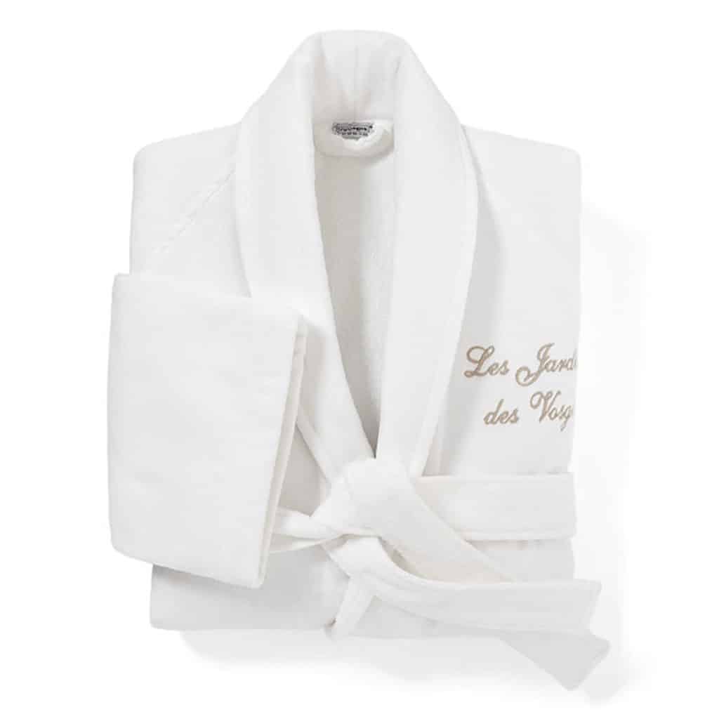 Δώστε στα υφάσματά σας μια έξτρα πινελιά φινέτσας, προσαρμόζοντάς τα ώστε να αντικατοπτρίζουν την εικόνα του ξενοδοχείου ή του σπα σας. Το κέντημα προσθέτει πρωτοτυπία και μοναδικότητα στα λευκά μπουρνούζια σας. Όλα τα μοντέλα μας μπορούν να προσαρμοστούν με κέντημα στην τσέπη, στο στήθος, στην πλάτη ή ακόμα και στο μπροστινό μέρος. στον ιμάντα. Στο εργαστήριό μας στο Gérardmer, κεντάμε τα μπουρνούζια σας με όλα τα σχέδια, τα λογότυπα, τα σλόγκαν ή τα ονόματα των επιχειρήσεων, στα χρώματα που επιθυμείτε.
