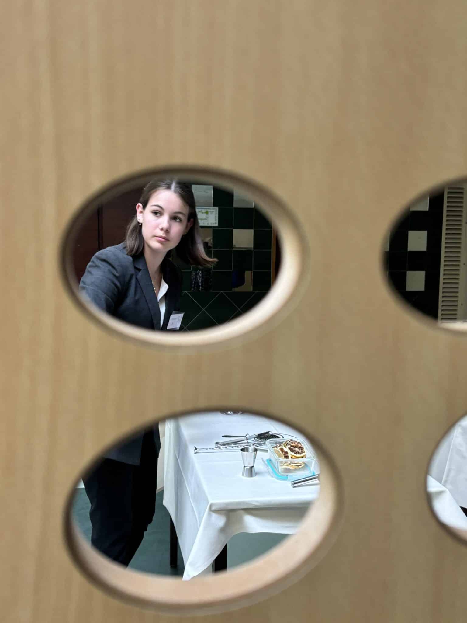 Puis en fin de journée durant la soirée de gala, les candidats ont dû redoubler de talents pour la seconde phase de l’épreuve pratique. Celle-ci consistait à, prendre la commande des boissons, énoncer les plats, interagir avec les clients en fonction des demandes spécifiques et à réaliser des techniques spécifiques du métier comme le carafage, la découpe d’une viande, ou encore le flambage de fraises au rhum.