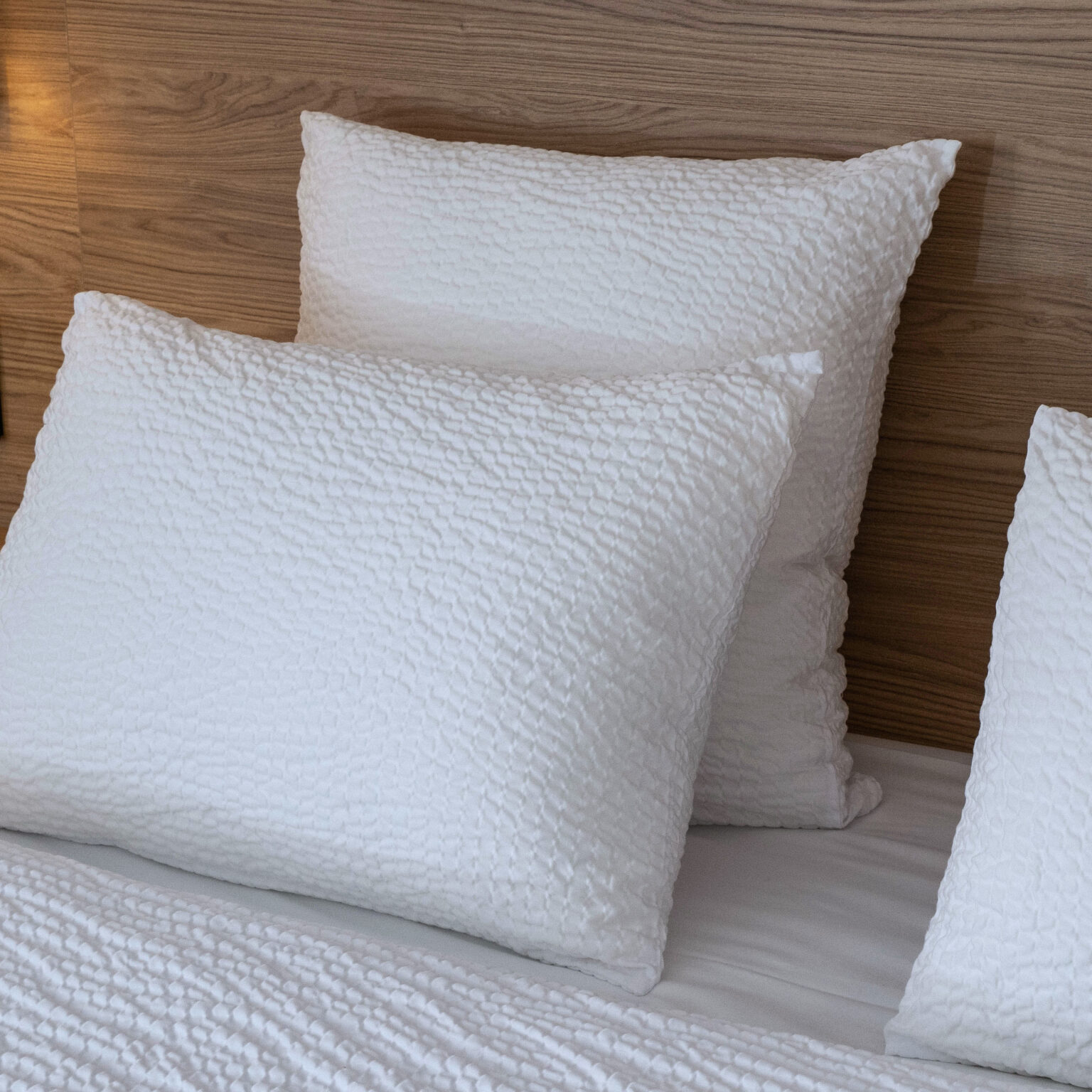 Apportez une note de fraicheur et d'élégance avec cette gamme d'un blanc lumineux en polycoton gaufré. Son relief subtil permet une mise en place rapide sans repassage tout en conservant une allure soignée.