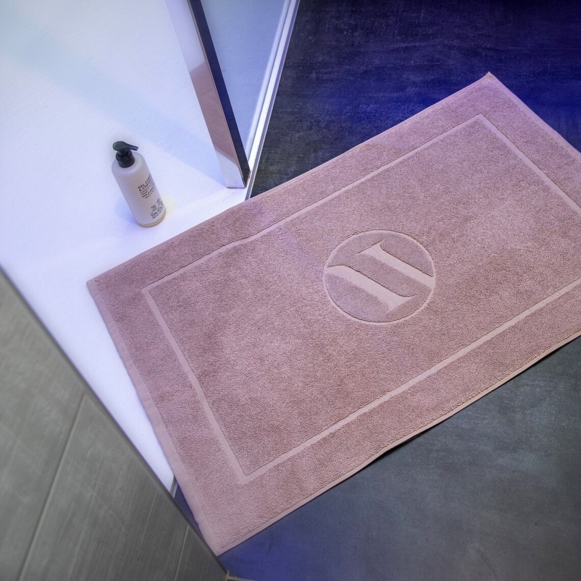- Tapis de bain en coton uni orné d'un monogramme au centre. Eponge 750grs/m² boucles fil retors pour une excellente absorption. Déclinée en 2 coloris, blanc et anthracite lavables à 95°. Finition renforcée en double piqûre tout autour afin de répondre aux exigences professionnelles.
